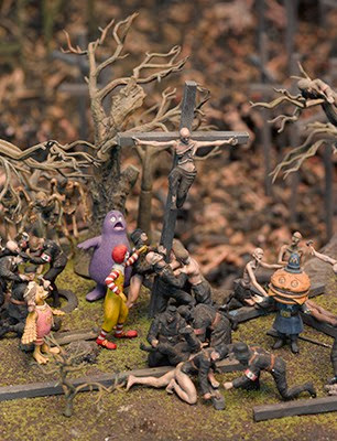Mención aparte merecen sus dioramas, pequeños teatros para un museo de historia natural del horror y del ridículo, donde se representan mezcladas todas las batallas, las libradas por los humanos y también las de los Thundercats y las de Godzilla, todos los derramamientos de sangre imaginados o sólo llevados a cabo por el hombre. Juguetes que mezclan violencia, vulgaridad, comercialismo y cadáveres apilados sobre cadáveres, pues cadáveres, aparte de excremento, es lo que más ha producido la humanidad en su gloriosa existencia: